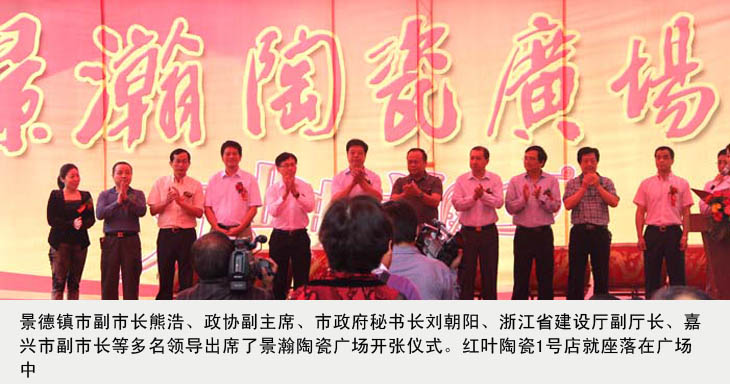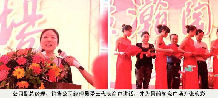 在景瀚陶瓷廣場落成開業(yè)慶典儀式上,公司副總吳愛云受王耀董事長委托,代表景德鎮(zhèn)陶瓷股份有限公司,代表紅葉陶瓷1號(hào)店,代表所有進(jìn)駐的業(yè)主們發(fā)言。她說:今天是五星級(jí)陶瓷購物天堂——景瀚陶瓷廣場開業(yè)的大好日子,受王耀董事長委托,我僅代表景德鎮(zhèn)陶瓷股份有限公司,代表紅葉陶瓷1號(hào)店,代表所有進(jìn)駐的業(yè)主們,對(duì)景翰陶瓷廣場的開業(yè)表示熱烈的祝賀。祝景瀚陶瓷廣場開業(yè)大吉,生意興隆。